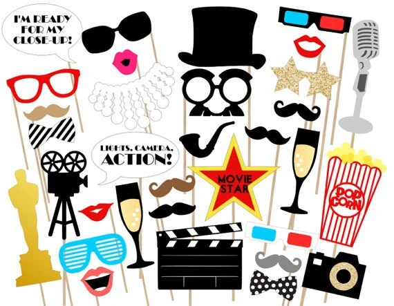 Rekvisitterne inkluderer blandt andet klaptræ, Oscar-inspireret statuette, popcornbæger, champagneglas, mikrofon, filmkamera, 3D-briller, “Movie Star”-stjerne, overskæg, læber og ikoniske citat-skilte som “Lights, Camera, Action!”. Alt sammen i klare, kontrastfulde farver, der fungerer perfekt foran kameraet.